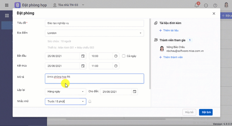 Sau khi hoàn tất đặt phòng tài liệu sẽ được gửi kèm theo mail mời họp tới người tham gia.