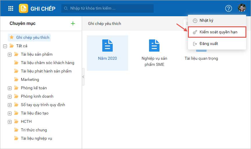 Chọn mục Ghi chép, sau đó chọn ghi chép được phân quyền. Thông tin quyền hạn của ghi chép đó sẽ hiển thị ở danh sách “Kiểm soát quyền hạn”.