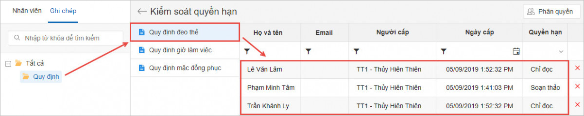Lưu ý: Trường hợp muốn phân quyền lại cho nhân viên hoặc phân quyền cho một nhân viên khác, người dùng có thể nhấn chọn chức năng Phân quyền. Chọn ghi chép muốn phân quyền, sau đó phân quyền xem ghi chép cho nhân viên tại mục Quyền hạn. Nhấn Lưu để hoàn tất việc phân quyền.