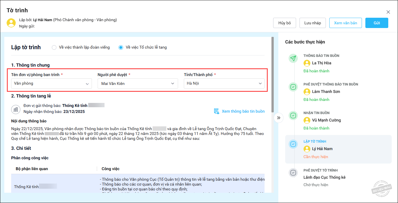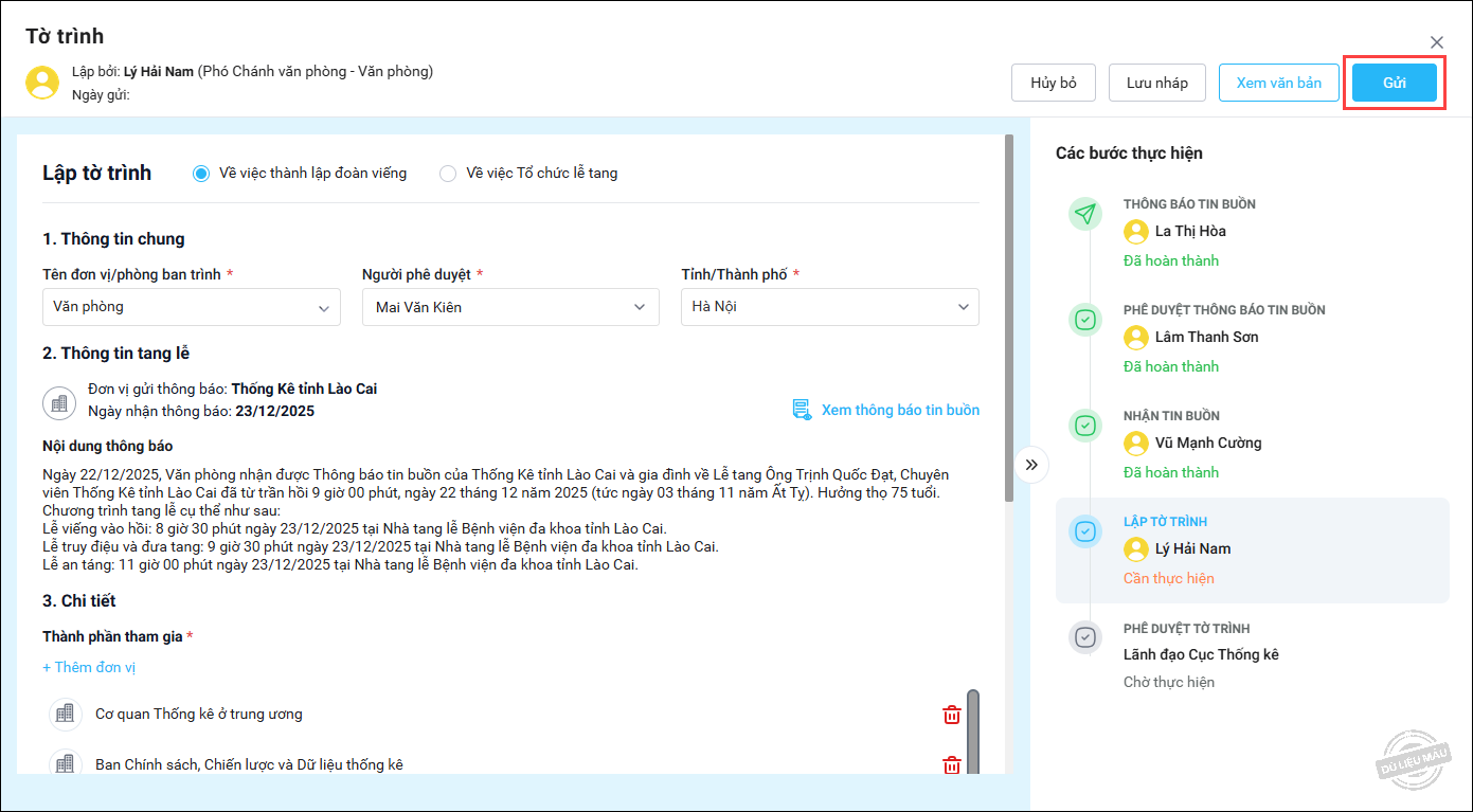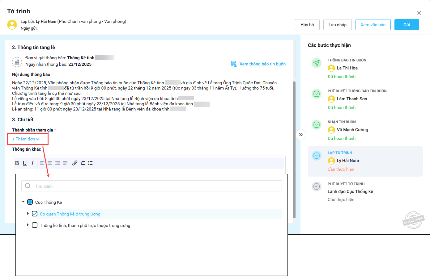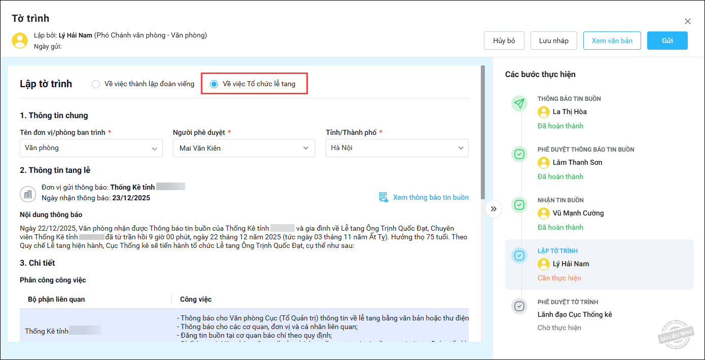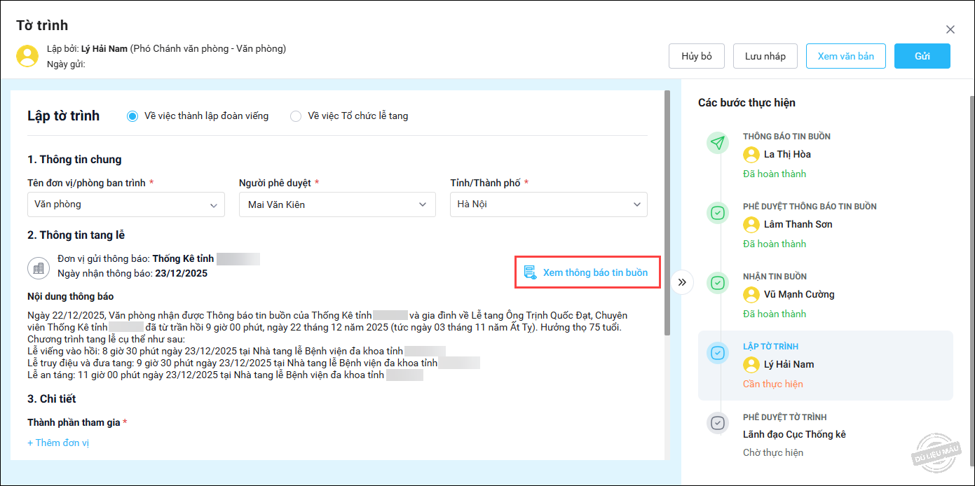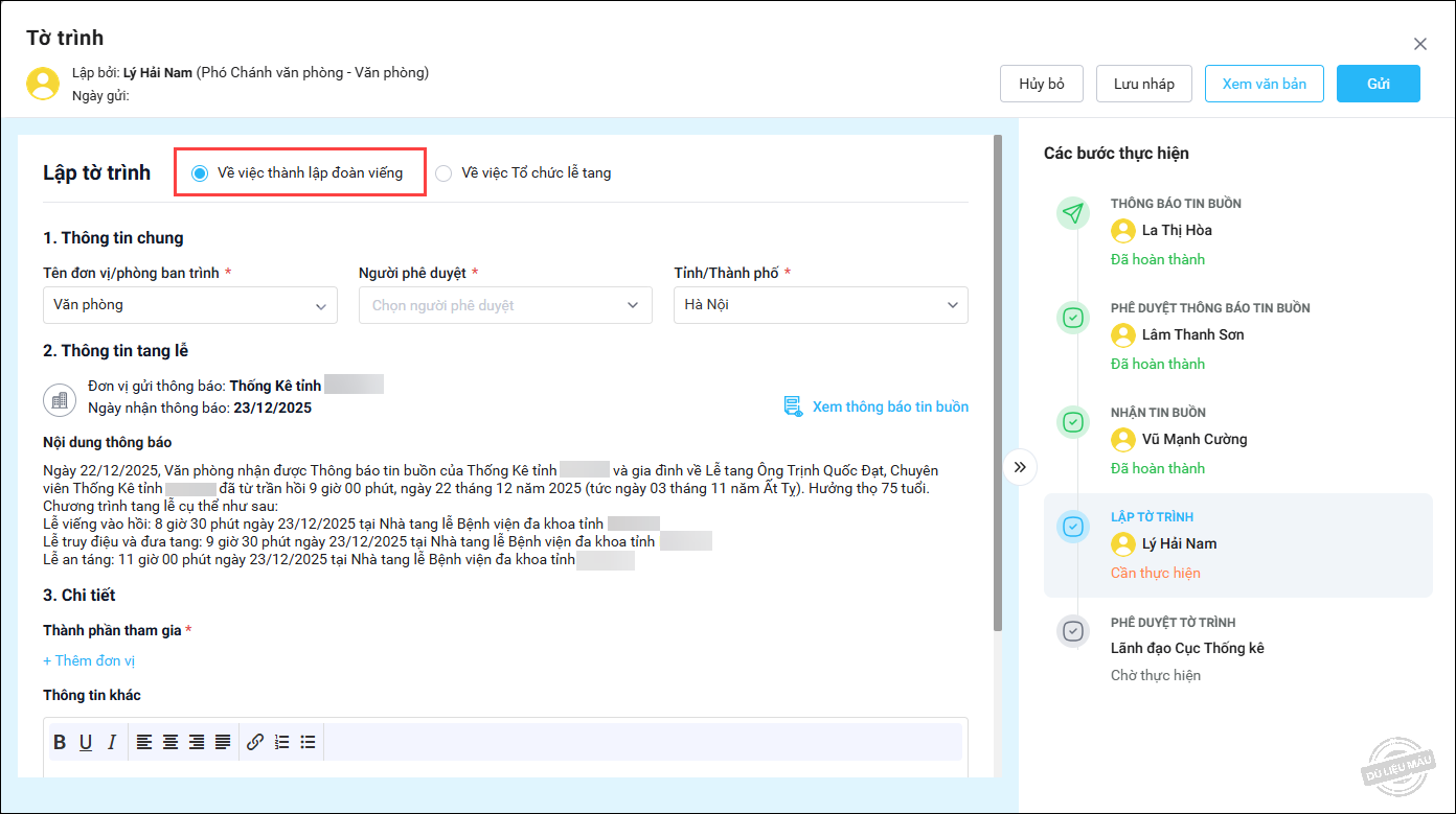 - Sau khi thông báo tin buồn được phê duyệt, thông báo sẽ được gửi đến người có trách nhiệm lập tờ trình thành lập đoàn viếng hoặc tổ chức lễ tang, tùy thuộc vào quy chế của đơn vị/ngành.