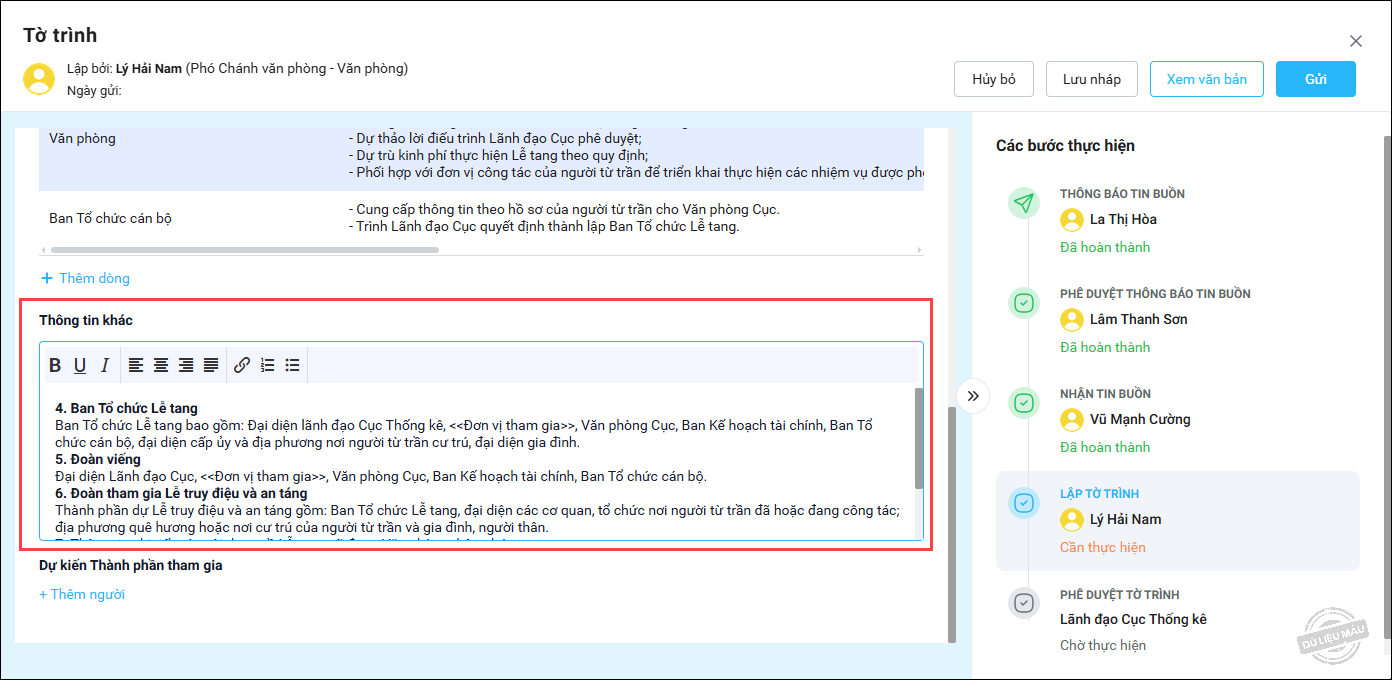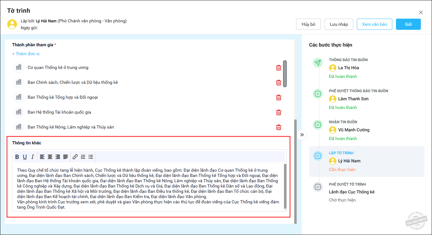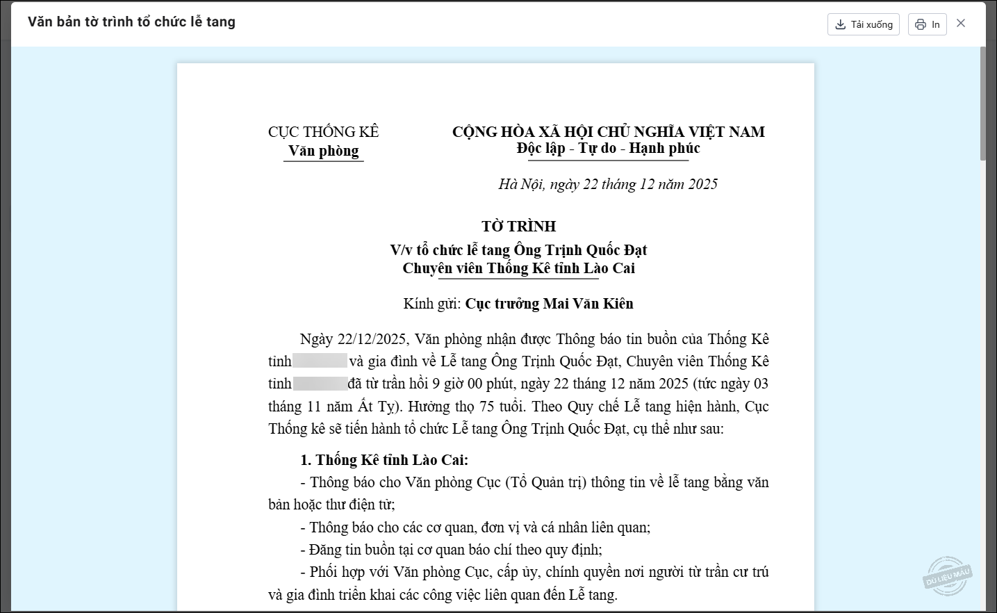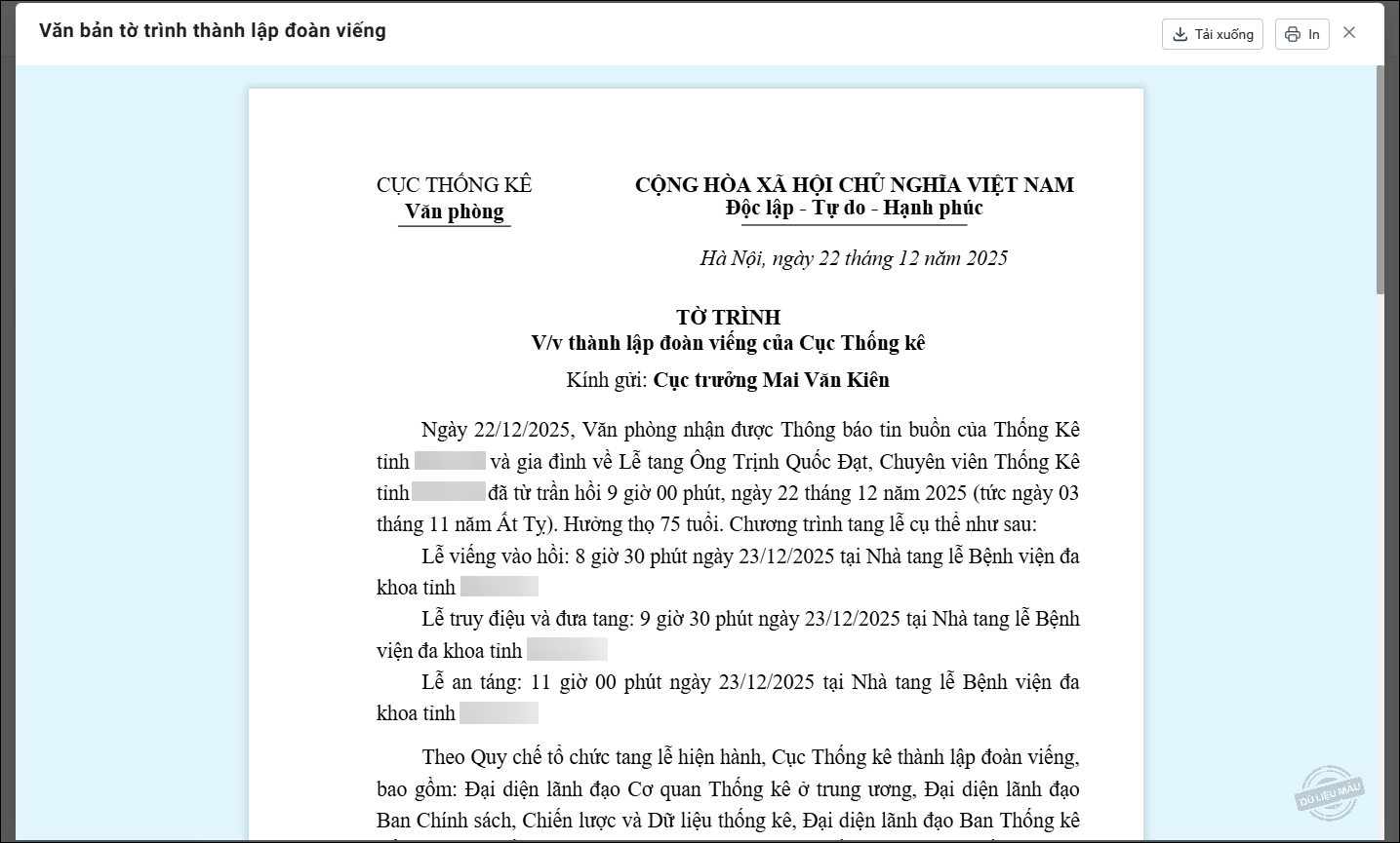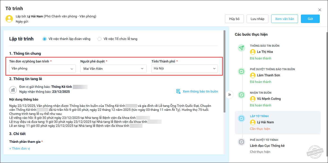 - Sau khi thông báo tin buồn được phê duyệt, thông báo sẽ được gửi đến người có trách nhiệm lập tờ trình thành lập đoàn viếng hoặc tổ chức lễ tang, tùy thuộc vào quy chế của đơn vị/ngành.