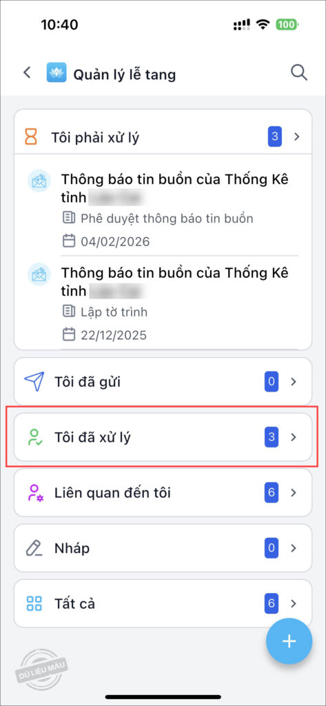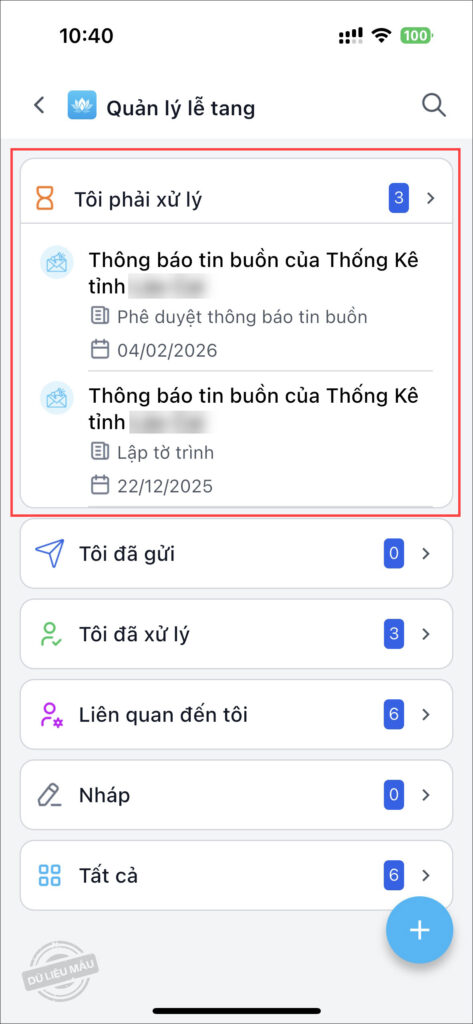 - Anh/chị có thể theo dõi thông báo tin buồn đã duyệt/trả lại tại danh sách Tôi đã xử lý.