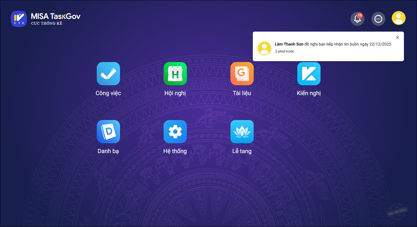 • Khi lãnh đạo đơn vị/trưởng phòng TCHC phê duyệt thông báo tin buồn, Chuyên viên Tổ quản trị Văn phòng Cục Thống kê sẽ nhận được thông báo. Nhấn vào thông báo để xem chi tiết thông báo.