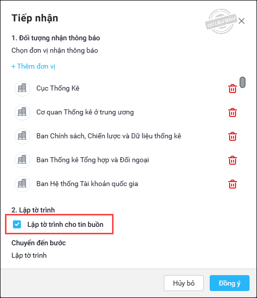• Nhấn Thêm đơn vị để chọn đơn vị để chọn đơn vị nhận thông báo. Chọn các đơn vị cần nhận thông báo.