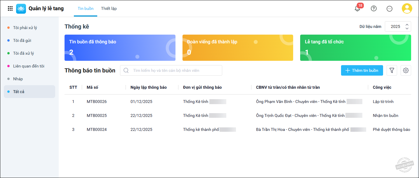 • Hoặc trên danh sách thông báo tin buồn, chọn thông báo cần tiếp nhận.