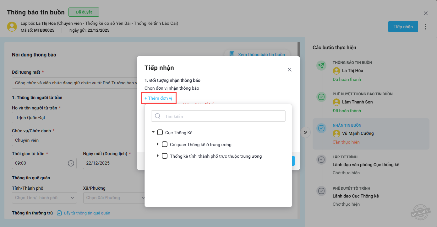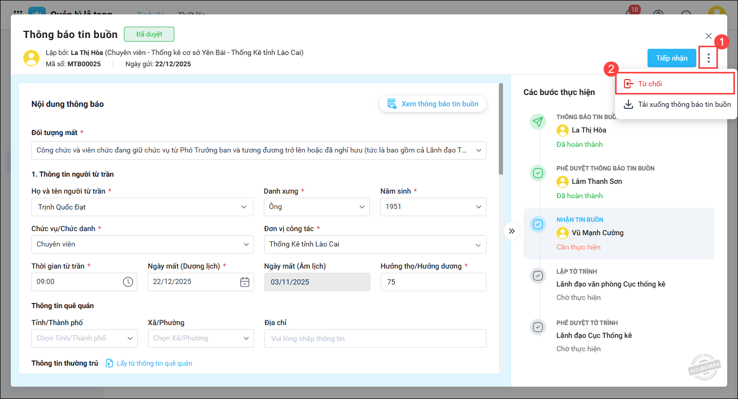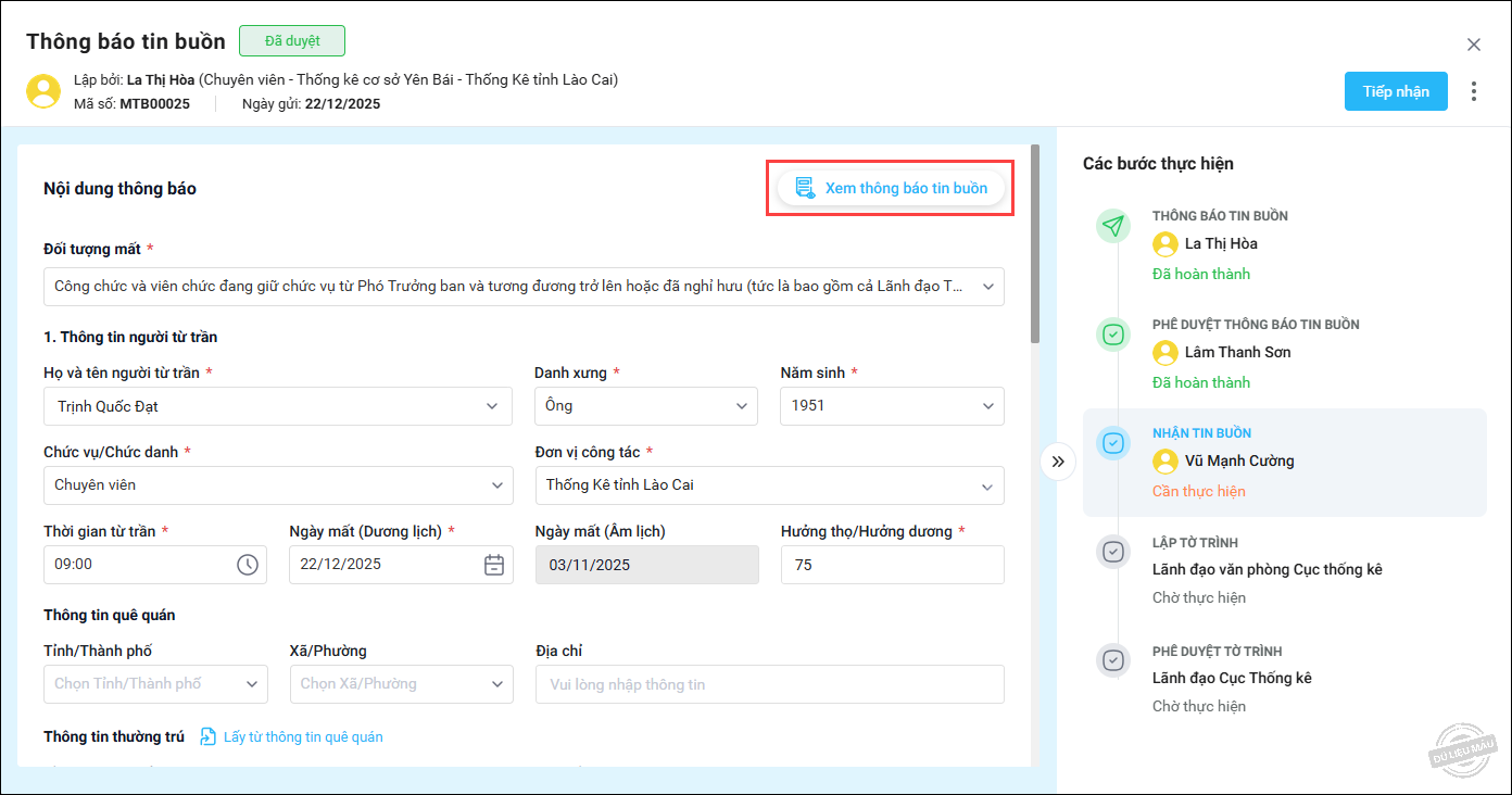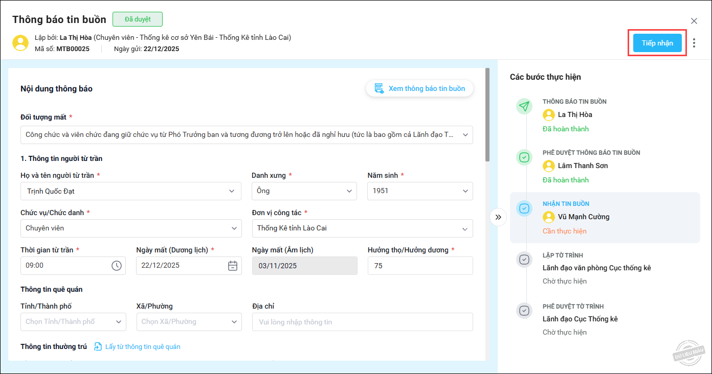 • Nếu thông báo tin buồn đã đầy đủ thông tin cần thiết, nhấn Tiếp nhận để thực hiện thông báo tin buồn đến toàn ngành hoặc các đơn vị liên quan.