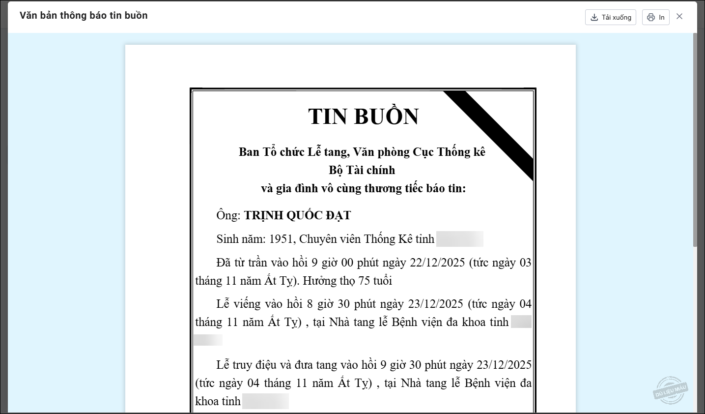 • Có thể chọn Xem thông báo tin buồn để xem văn bản thông báo.