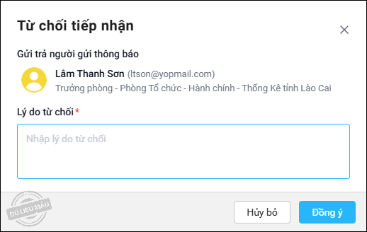 Nhập lý do từ chối và nhấn Đồng ý, quy trình sẽ quay về bước trước đó.